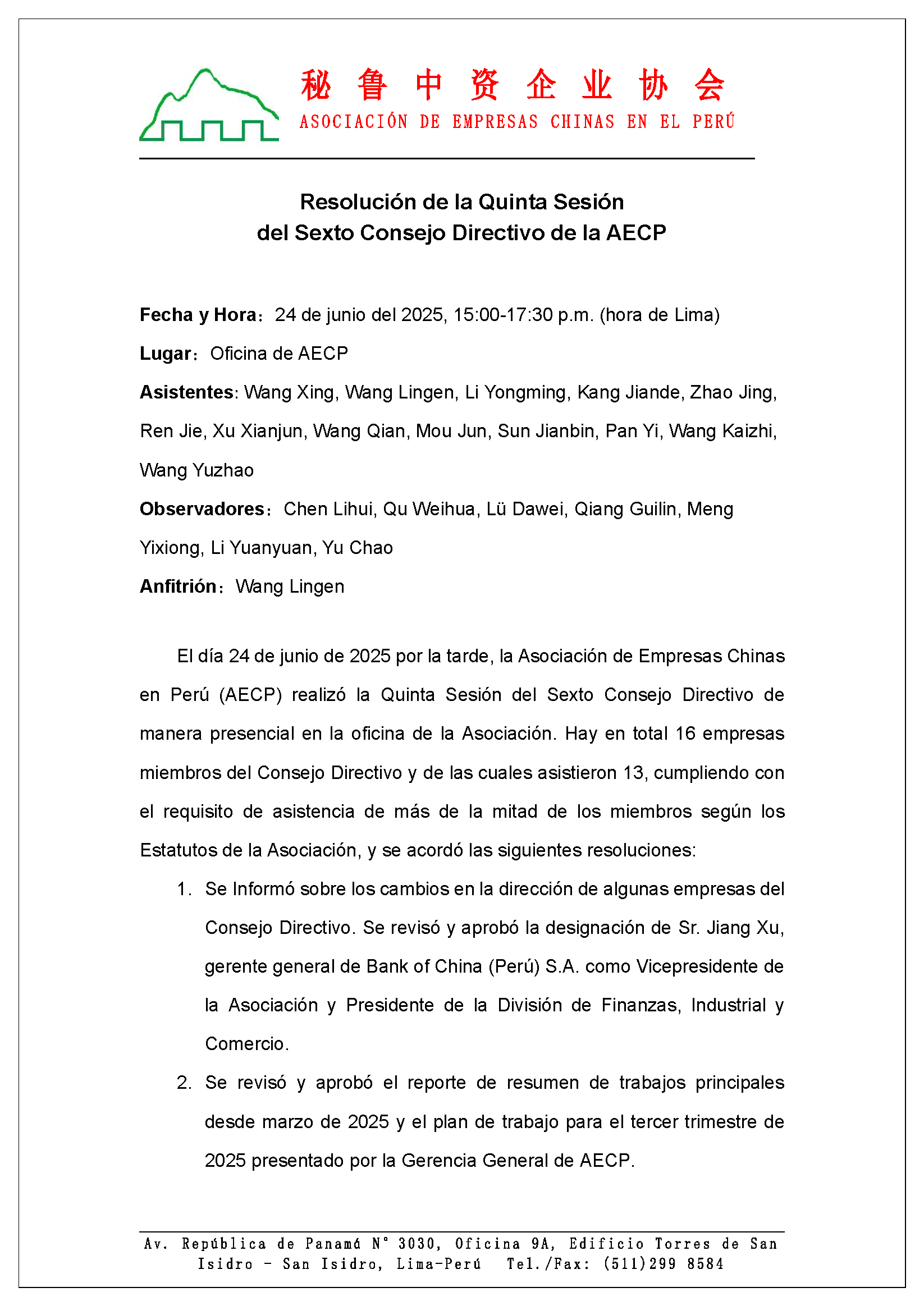 El día 24 de junio de 2025 por la tarde, la Asociación de Empresas Chinas en Perú (AECP) realizó la Quinta Sesión del Sexto Consejo Directivo de manera presencial en la oficina de la Asociación. Hay en total 16 empresas miembros del Consejo Directivo y de las cuales asistieron 13, cumpliendo con el requisito de asistencia de más de la mitad de los miembros según los Estatutos de la Asociación, y se acordó las siguientes resoluciones: