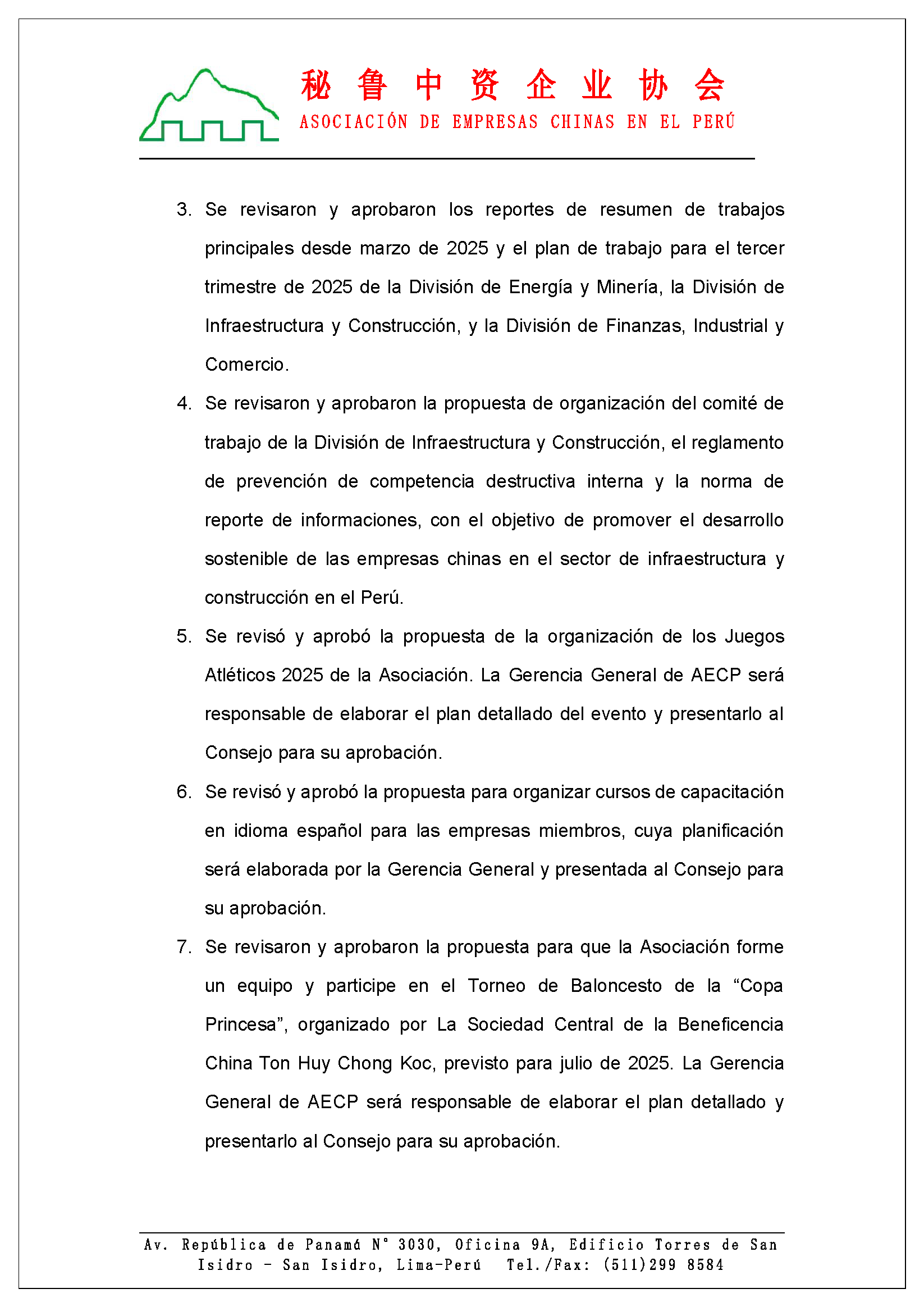 5. Se revisó y aprobó la propuesta de la organización de los Juegos Atléticos 2025 de la Asociación. La Gerencia General de AECP será responsable de elaborar el plan detallado del evento y presentarlo al Consejo para su aprobación.