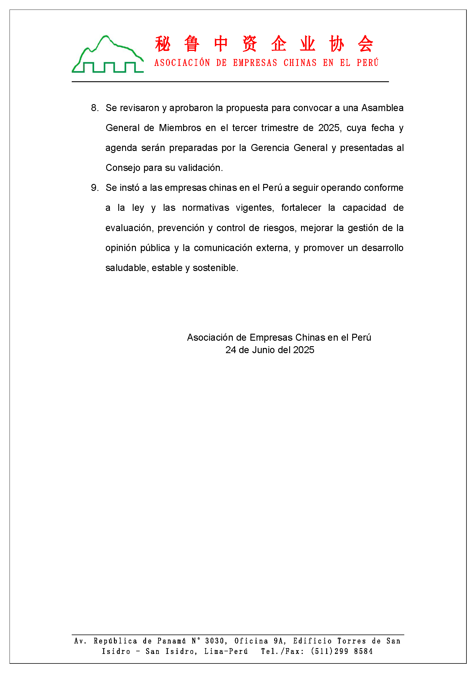 8. Se revisaron y aprobaron la propuesta para convocar a una Asamblea General de Miembros en el tercer trimestre de 2025, cuya fecha y agenda serán preparadas por la Gerencia General y presentadas al Consejo para su validación.