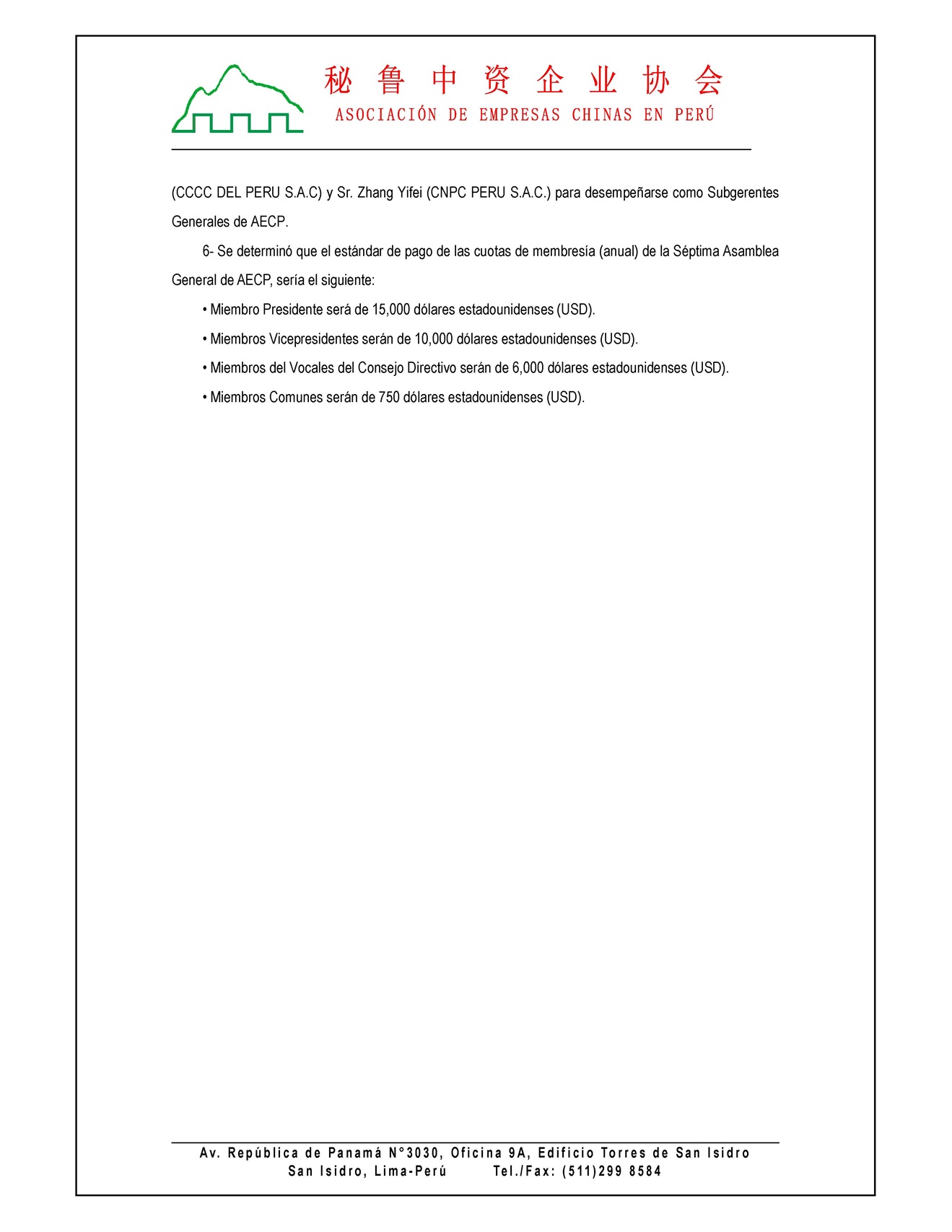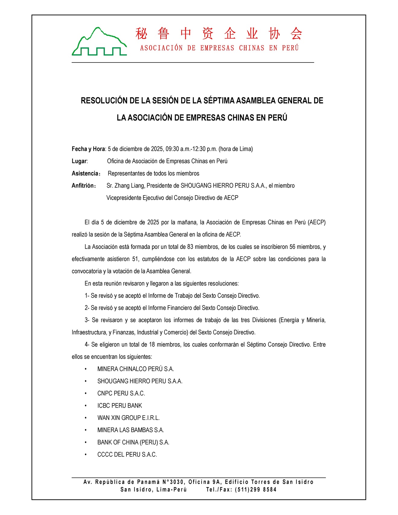 RESOLUCIÓN DE LA SESIÓN DE LA SÉPTIMA ASAMBLEA GENERAL DE LA ASOCIACIÓN DE EMPRESAS CHINAS EN PERÚ