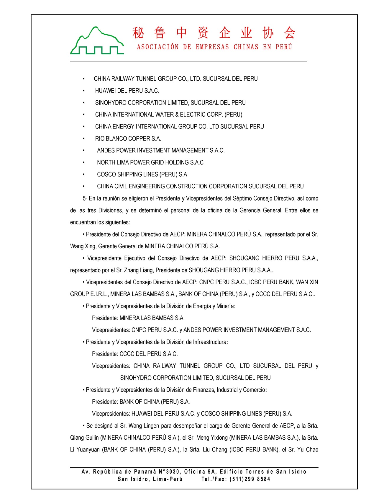 - Se designó al Sr. Wang Lingen para desempeñar el cargo de Gerente General de AECP, a la Srta. Qiang Guilin (MINERA CHINALCO PERÚ S.A.), el Sr. Meng Yixiong (MINERA LAS BAMBAS S.A.), la Srta. Li Yuanyuan (BANK OF CHINA (PERU) S.A.), la Srta. Liu Chang (ICBC PERU BANK), el Sr. Yu Chao (CCCC DEL PERU S.A.C) y Sr. Zhang Yifei (CNPC PERU S.A.C.) para desempeñarse como Subgerentes Generales de AECP.