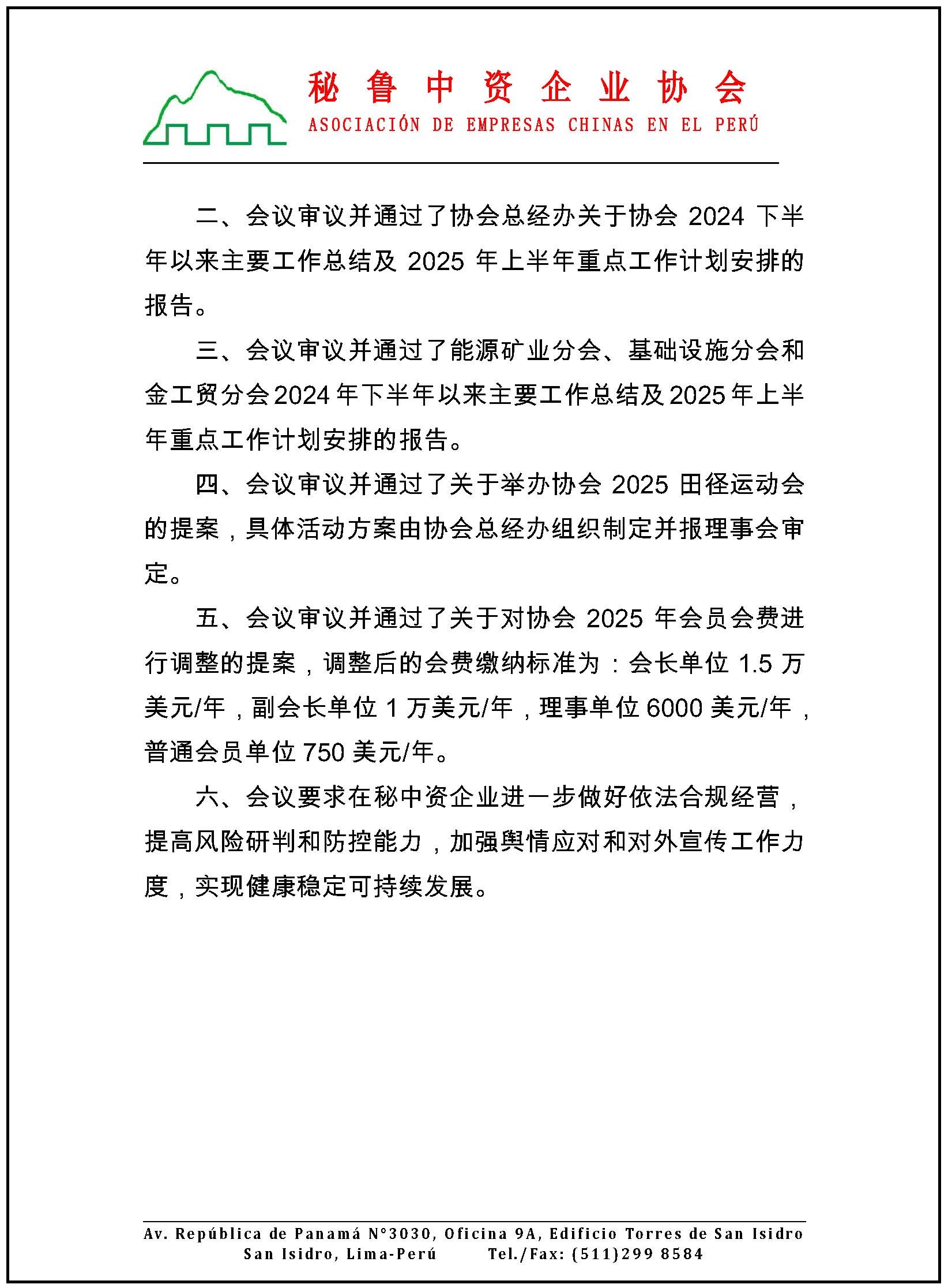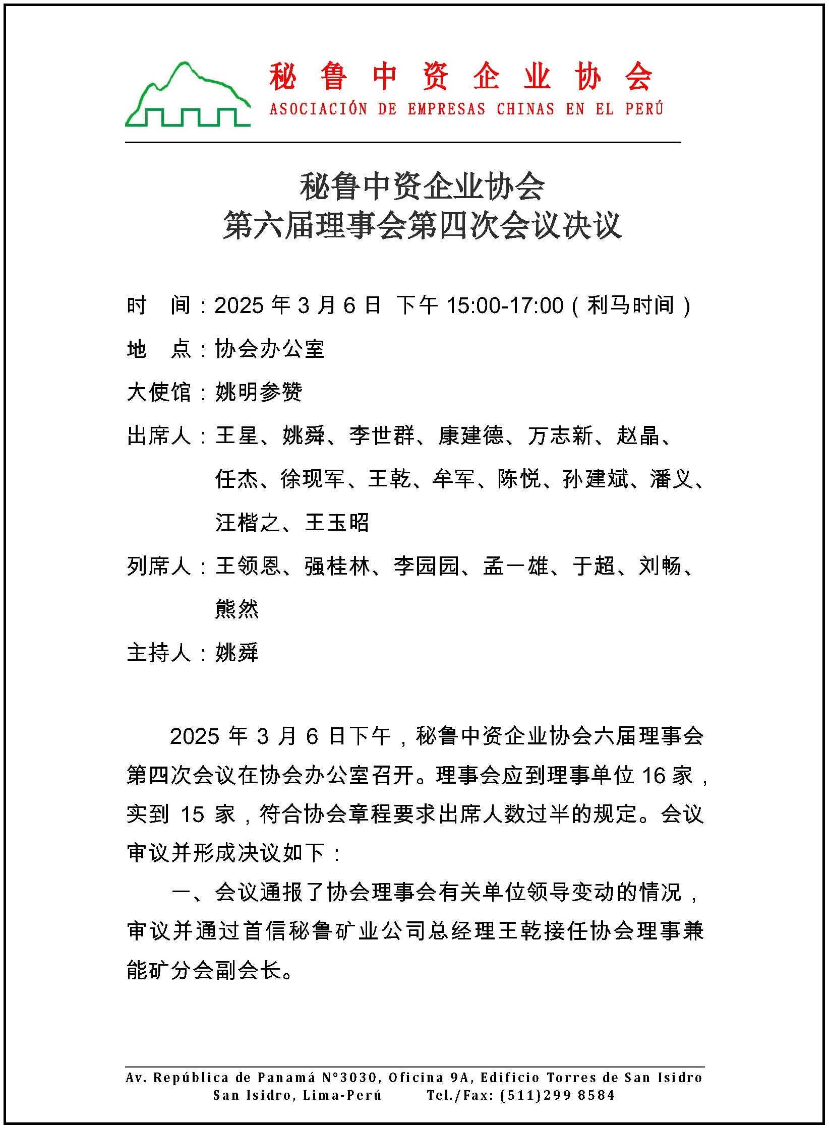秘鲁中资企业协会 第六届理事会第四次会议决议