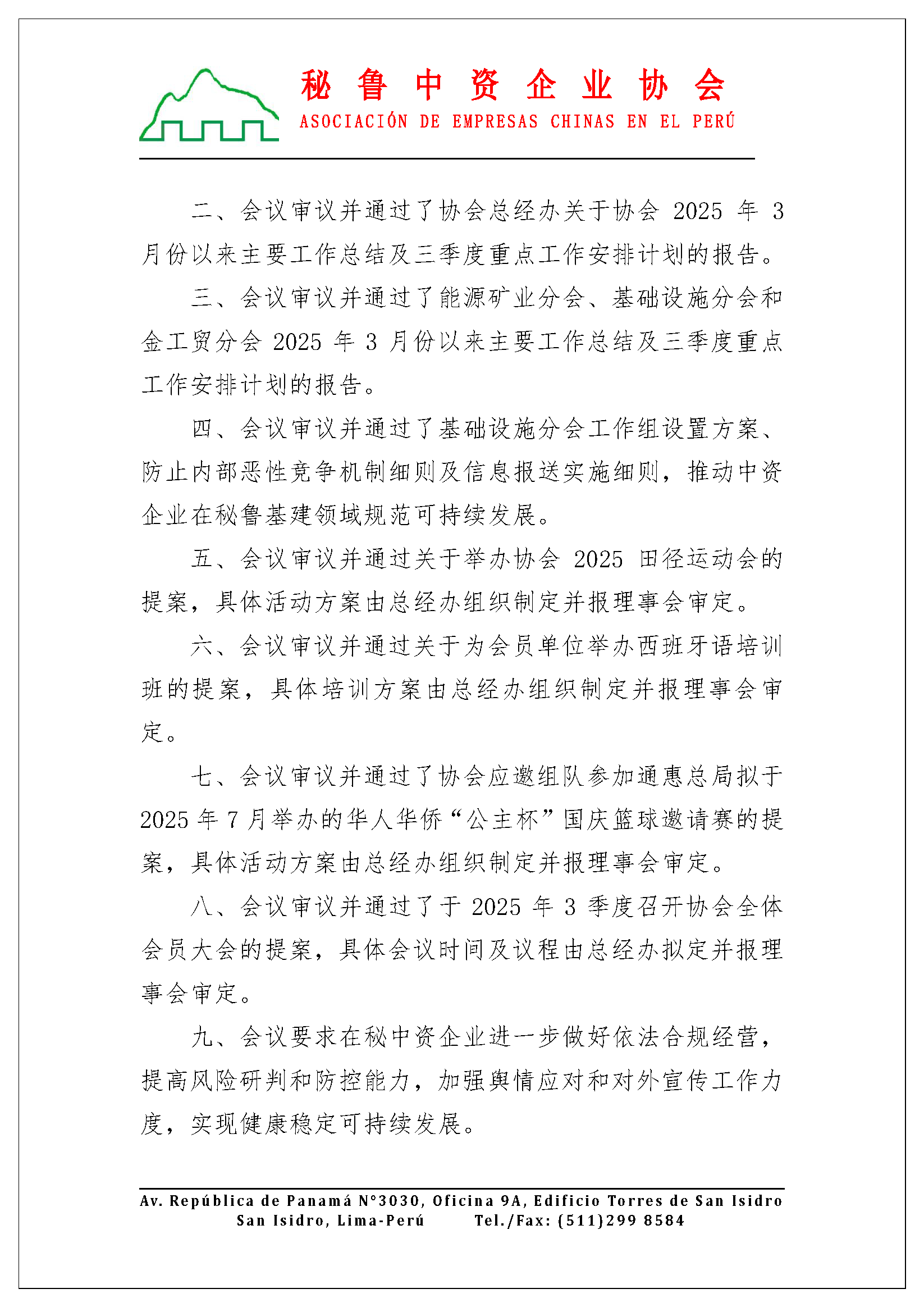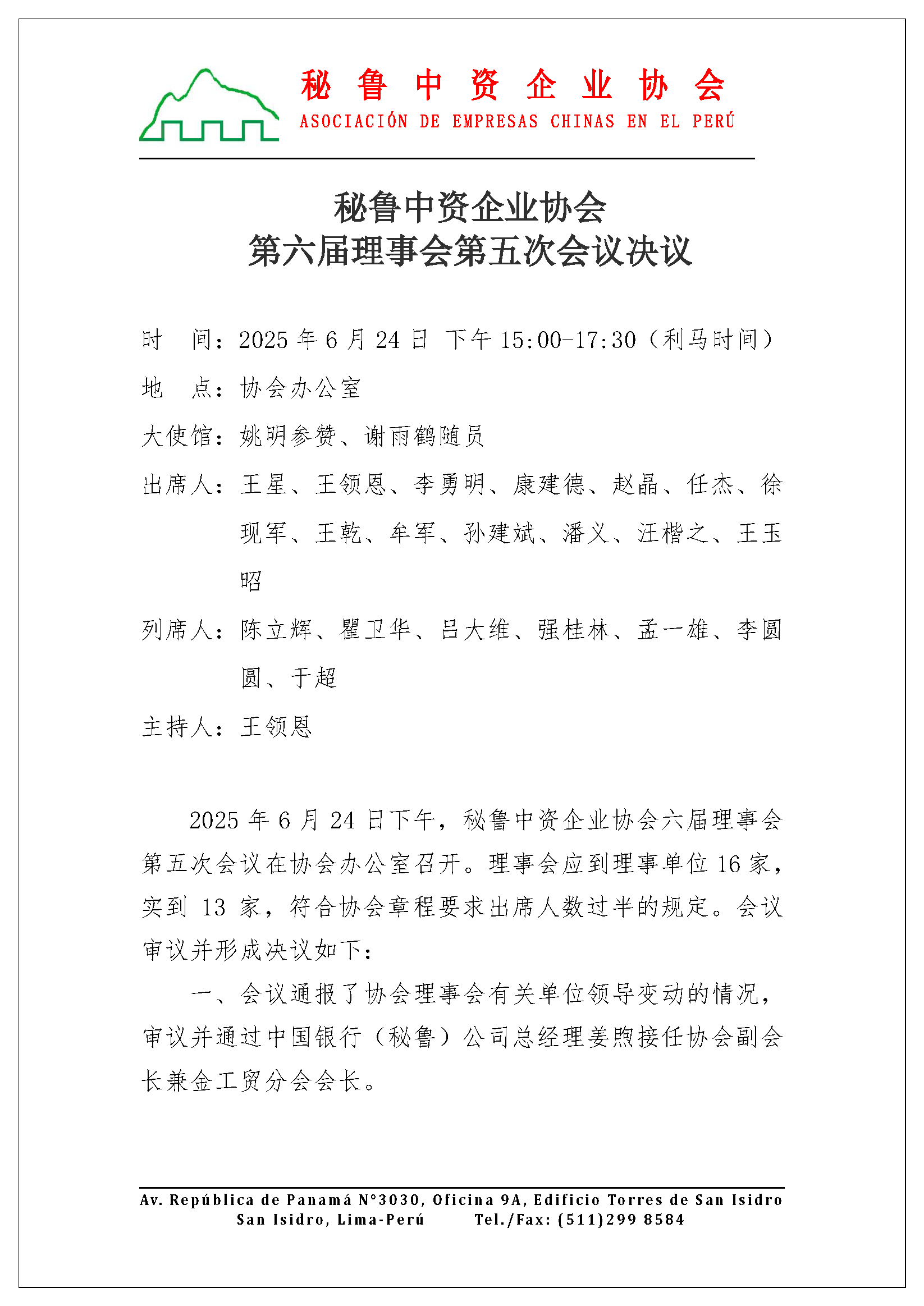 秘鲁中资企业协会 第六届理事会第五次会议决议